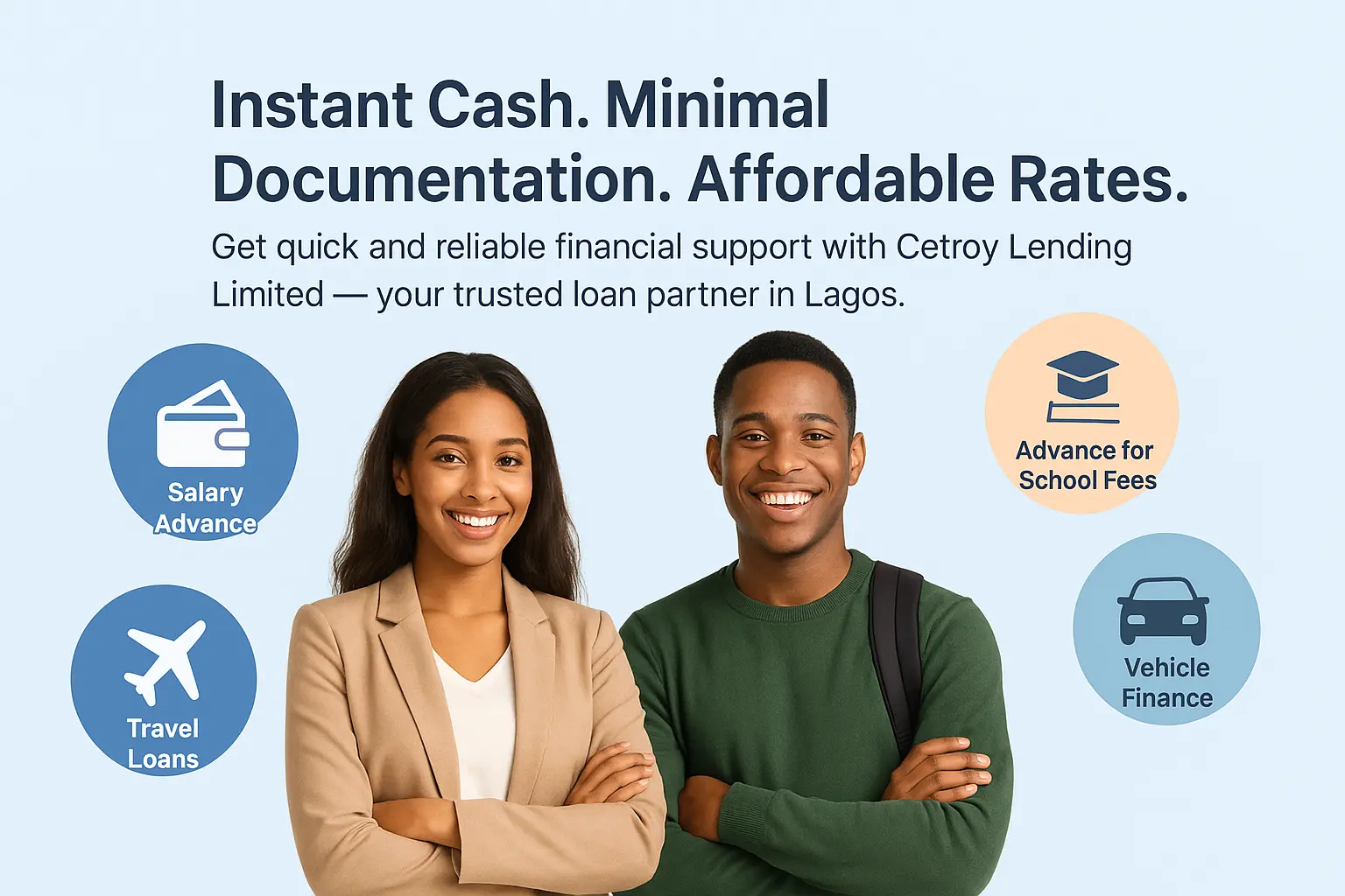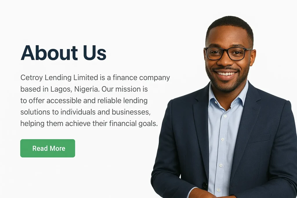 Cetroy Lending Limited is a Lagos-based finance company committed to expanding access to responsible credit for individuals, entrepreneurs and small businesses. We blend financial expertise with local market knowledge to deliver loan solutions that help our customers grow, manage cashflow, and reach their goals.